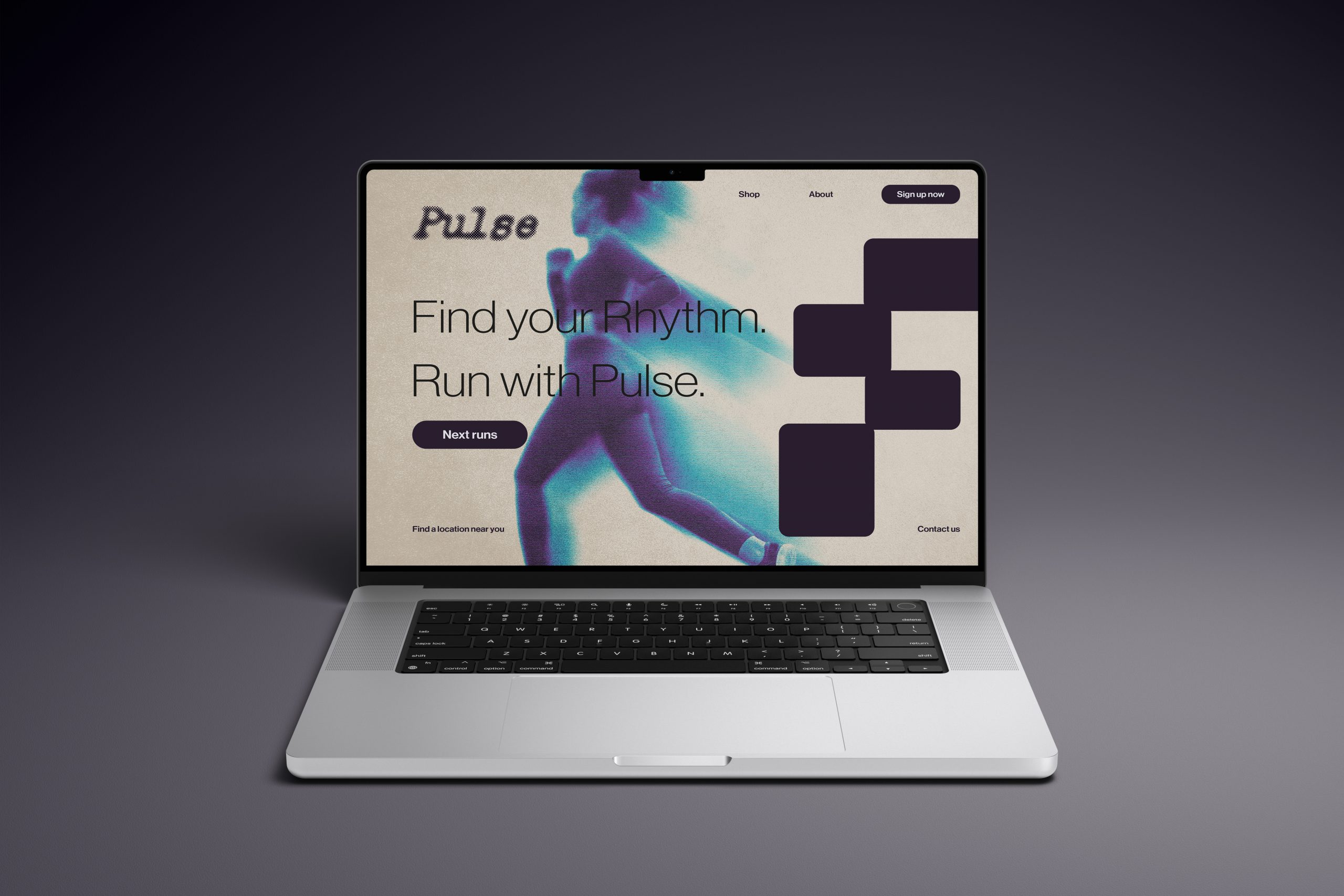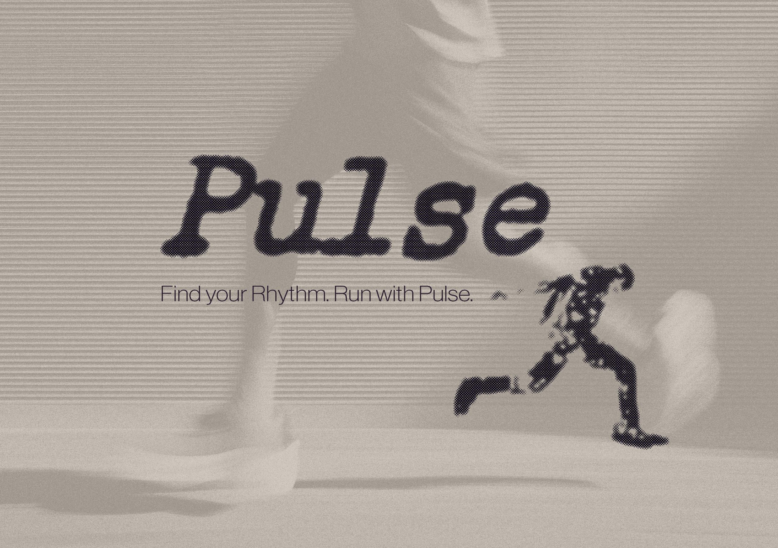 Ein visuelles Branding-Konzept, das die Energie des urbanen Laufens einfängt. Mit dem Claim „Find your Rhythm. Run with Pulse.“ verbindet die Marke Bewegung, Rhythmus und Community. Starke Typografie, dynamische Bildsprache und ein digitales Interface machen Pulse physisch wie virtuell erlebbar.